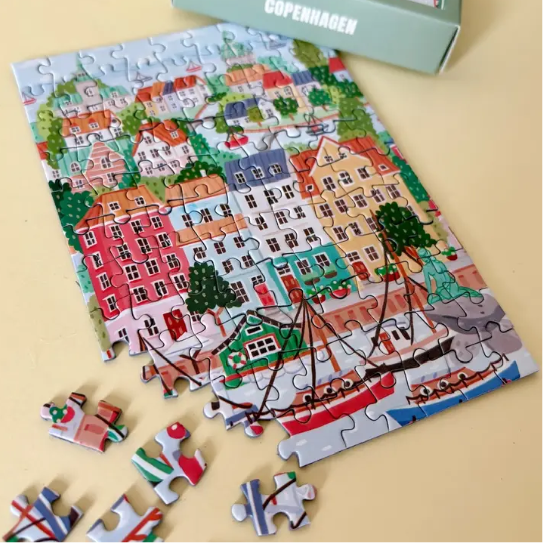 De 99-delige mini-puzzel “Copenhagen” toont de kleurrijke grachtenhuizen, de gezellige stadssfeer en het Noordse licht in een liefdevol geïllustreerde stijl. Plasticvrije verpakking en gemaakt van gerecycled karton – perfect voor een creatieve mini-pauze en een lief cadeau. Laat Kopenhagen je inspireren, stukje voor stukje.
